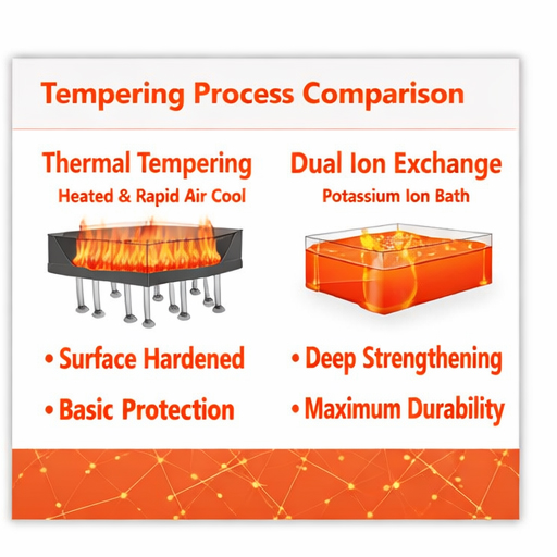 - Adds sophisticated treatments, including as dual ion exchange, stress balancing, and edge reinforcing, to double tempering. As a result, the entire glass surface is strengthened and protected more evenly.