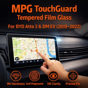 The MPG TouchGuard Tempered Film Glass is a wise purchase for owners of BYD Atto 3 and DM EVs who wish to maintain the interior condition of their cars. It keeps the display appearing brand new, protects against everyday damage, and preserves the original screen functionality. This protection guarantees that your touchscreen will be clear, responsive, and well-protected for years to come, whether you’re traveling great distances or commuting every day.